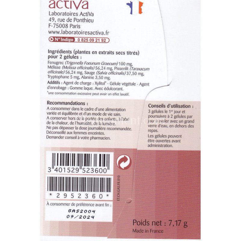 Ingrédients pour 2 gélules : Fenugrec (Trigonella Foeunum Graecum) 100 mg - Mélisse (Melissa officinalis) 56,24 mg - Pissenlit (Taraxacum officinale) 56,24 m - Sauge (Salvia officinalis) 37,50 mg - Tryptophane 5 mg - Alanine 3,50 mg.