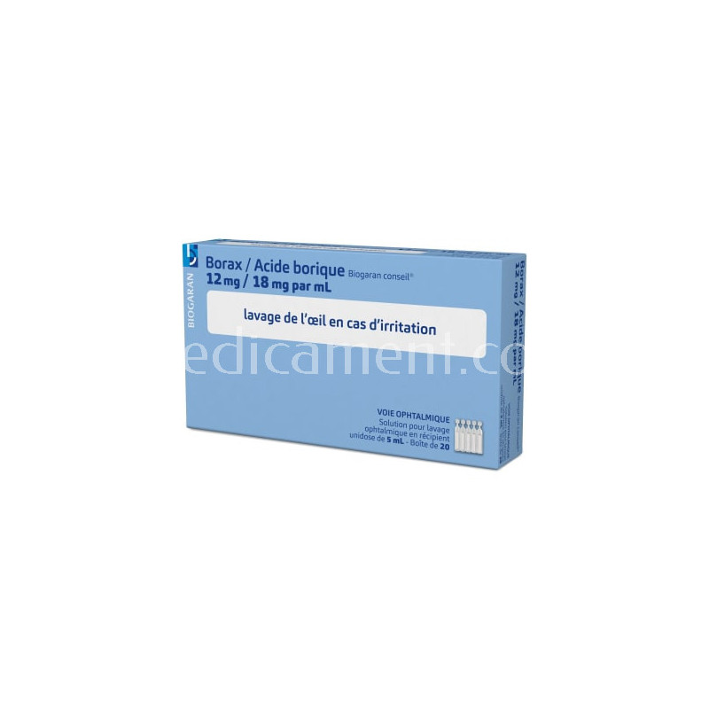 | Dénomination | BORAX/ACIDE BORIQUE BIOGARAN CONSEIL 12 mg/18 mg par ml, solution pour lavage ophtalmique en récipient unidose |