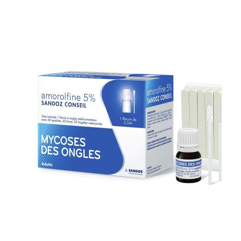 Amorolfine 5 % Sandoz Conseil est un vernis à ongles médicamenteux antifongique traitant les mycoses unguéales, ou onychomycoses, infections dues à un champignon microscopique touchant les ongles des mains et des pieds chez l'adulte.