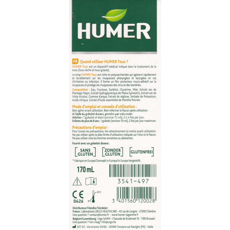 Humer Toux sèche et grasse Sirop du laboratoire Urgo est un dispositif médical indiqué dans le traitement de la toux mixte sèche et/ou grasse chez les adultes et les enfants de plus de 8 ans. Riche en polysaccharides, il protège et hydrate les muqueuses pharyngées et laryngées en cas d'irritation ou d'infection. Il forme un film muco-adhésif dans la gorge pour isoler des virus et bactéries.