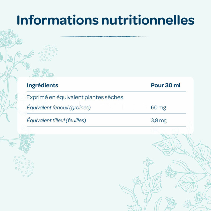 Ingrédients : Eau, sirop de glucose d'origine végétale*, extrait de plantes* (graines de fenouil* - Foeniculum vulgare, sommités fleuries de tilleul* - Tilia cordata, fleurs d’oranger* - Citrus aurantium (0,16%)), jus concentré de citron - Citrus limon.