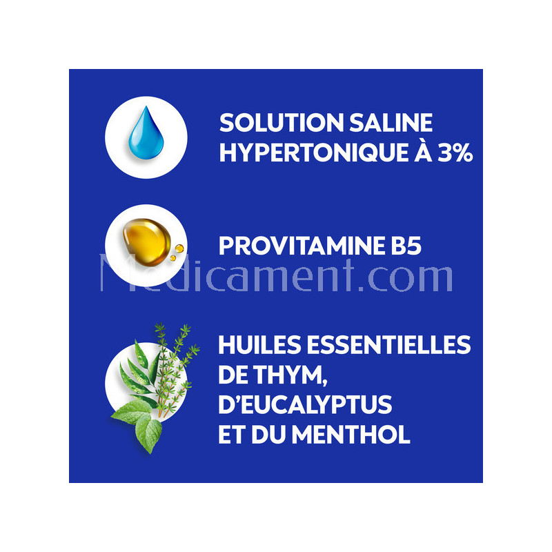 Eau (93,86%), Chlorure de sodium (3,05%), dexpanthenol (2%), hydroxystéarate de macrogolglycerol, phosphate de dihydrogène potassique, phosphate d'hydrogène dipotassique, huile essentielle d'eucalyptus, menthol, acétate de bornyl, acétate d'isobornyl, huile essentielle de thym.