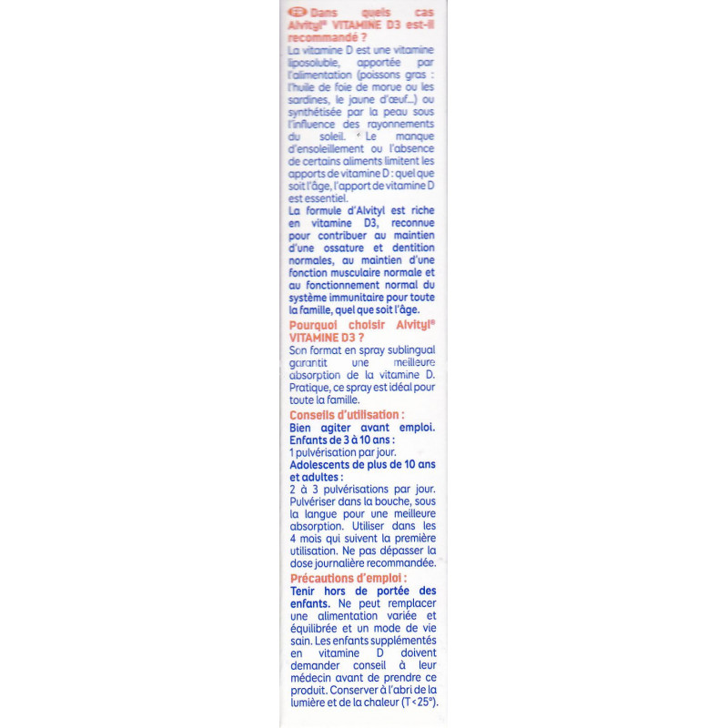 Vitamine D3 issue de la lanoline Alvityl est un complément alimentaire qui permet le maintien d'une ossature et dentition normales en favorisant la fixation du calcium. La période de la ménopause chez la femme peut entrainer une baisse de fixation du calcium avec risque d'ostéoporose. Un apport en vitamine D est alors conseillé.
