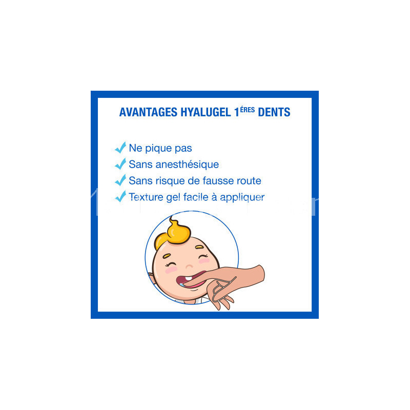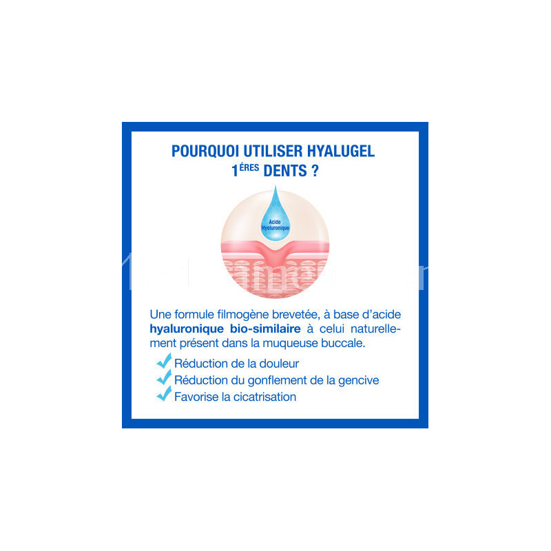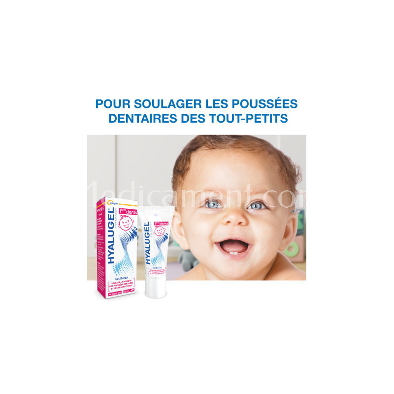 HYALUGEL® 1ères dents est un dispositif médical sous forme de gel buccal indiqué dans les inflammations des gencives spécifiques de la petite enfance, telles celles liées aux poussées dentaires des nourrissons ou aux traumatismes. Les essais cliniques démontrent que l’application de HYALUGEL® 1ères dents réduit la douleur, le gonflement et favorise la cicatrisation de la gencive.
