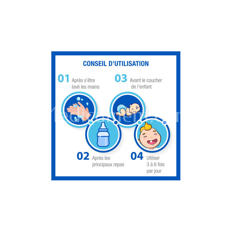 Appliquer de préférence après les repas et avant de coucher l’enfant pour favoriser la formation du film et prolonger le soulagement ainsi procuré. Utiliser 3 à 6 fois par jour, ou au besoin.