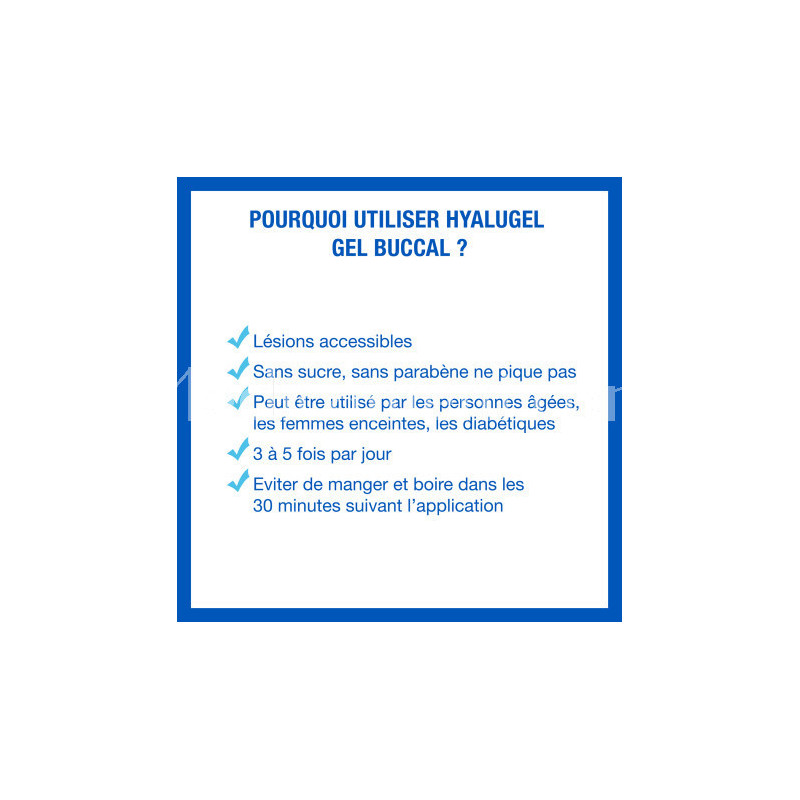 Utiliser HYALUGEL® après une hygiène buccale correcte et après les principaux repas, 3 à 5 fois par jour pendant 3 à 4 semaines. Continuer jusqu’à disparition de tous les symptômes. Eviter de manger et boire pendant au moins 30 minutes après l’utilisation de HYALUGEL®.