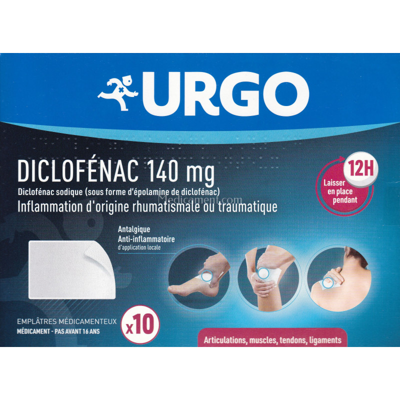 Diclofénac 140 mg en emplâtres du laboratoire Urgo est un médicament anti-inflammatoires non stéroïdiens (AINS) générique du VoltarenPlast qui soulage la douleur. Il est utilisé pour le traitement local de courte durée en cas de traumatismes bénins douloureux : foulures, entorses ou contusions, par exemple résultant de la pratique sportive, et autres inflammations d'origine rhumatismale ou traumatique affectant les articulations, les muscles, les tendons ou les ligaments.