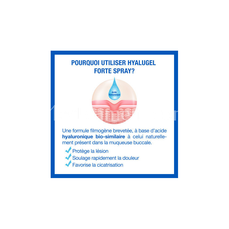 Hyalugel Forte possède une formule filmogène brevetée, à base d’acide hyaluronique bio-similaire à celui naturellement présent dans la muqueuse buccale. Sa concentration en acide hyaluronique 4 fois supérieure par rapport au spray classique (0,04 %) permet une triple action :