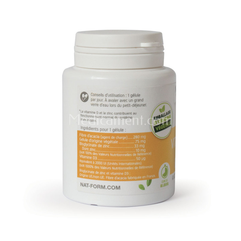 Vitamine D3 et Zinc du laboratoire Nat&Form est un complément alimentaire à base de bisglycinate de zinc et de vitamine D pour un fonctionnement normal du système immunitaire.