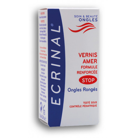 Le Vernis amer Stop Ongles rongés Ecrinal du laboratoire Asepta est un vernis pour application unguéale destiné à lutter contre l'onychophagie, le fait de se ronger les ongles et la peau autour des ongles. Transparent, il est invisible et son amertume lui donne un goût amer désagréable s'il est en contact avec la bouche. Son utilisation évitera des mains disgracieuses et les risques d’infection (panaris) que l'onychophagie peut induire tout en facilitant la repousse de l’ongle Sa formule enrichie en Provitamine B5 favorise la repousse ongulaire. Il peut être utiliser chez l'enfant dès 3 ans pour éviter qu’il ne suce son pouce.