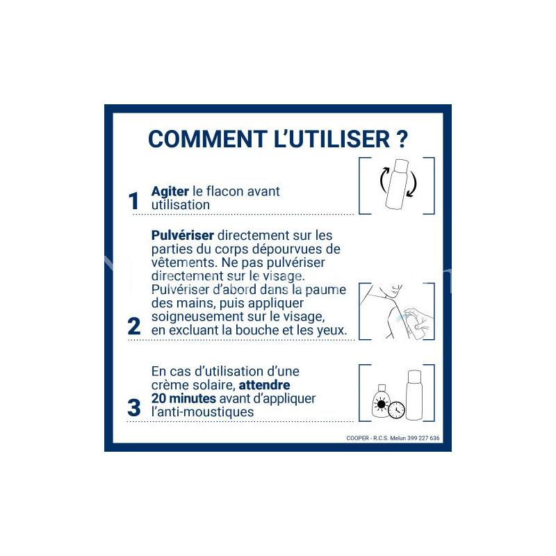 Pulvériser la brume uniformément sur la peau découverte 1 fois par jour pour les enfants de 6 mois à 11 ans ou 2 fois par jour à partir de 12 ans, et sur les vêtements si besoin. En cas d'application d'une protection solaire, laisser sécher et attendre 20 minutes avant d'appliquer le répulsif.