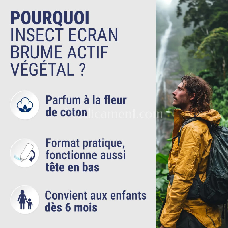 Insect Ecran Brume Végétale repousse les moustiques et les tiques grâce à sa formulée à base d’actif à base d’huile essentielle d’eucalyptus citriodora (EC Oil (H/C)) obtenu à partir des feuilles d’eucalyptus citronné. Cet actif puissant offre une protection jusqu'à 10h sur les moustiques en zones tempérées et 12h sur les tiques (5h sur moustiques et 6h sur tiques (Ixodes ricinus) si une seule application par jour).