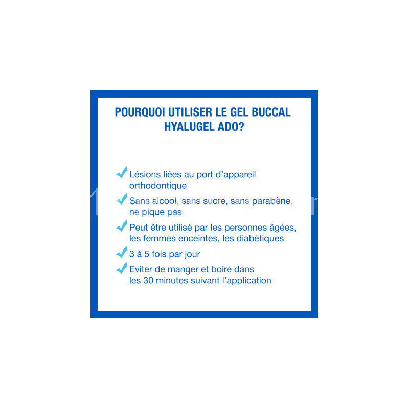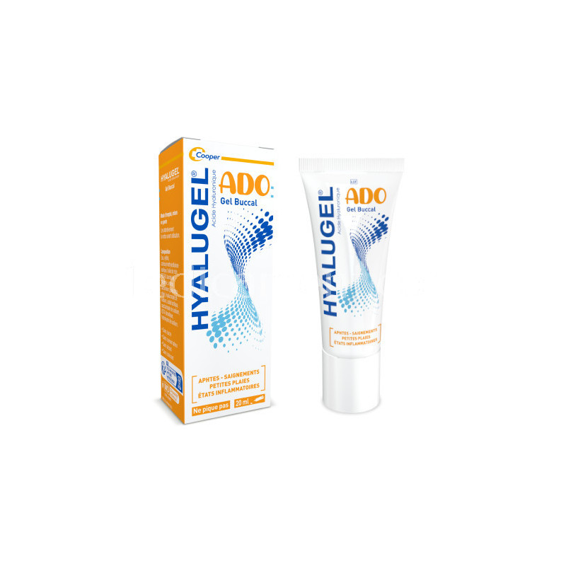 Hyalugel ADO Gel buccal du laboratoire Cooper est un dispositif médical indiqué dans le traitement de la douleur causée par les états inflammatoires des gencives, de la langue ou de la bouche en général : gingivites, saignements, récessions gingivales, poches gingivales, aphtes, plaies causées par le port d’un appareil orthodontique, extractions dentaires, traumatisme après une intervention chirurgicale.