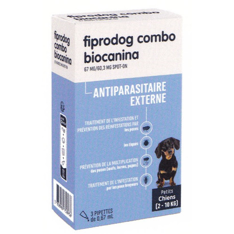 Fiprodog Combo du laboratoire Biocanina est un antiparasitaire externe à base de fipronil et S-méthoprène. Le S-méthoprène, régulateur de croissance ayant une activité ovicide et larvicide, préveint la multiplication des puces (oeufs, larves et pupes) dans l'environnement pendant 8 semaines après application.