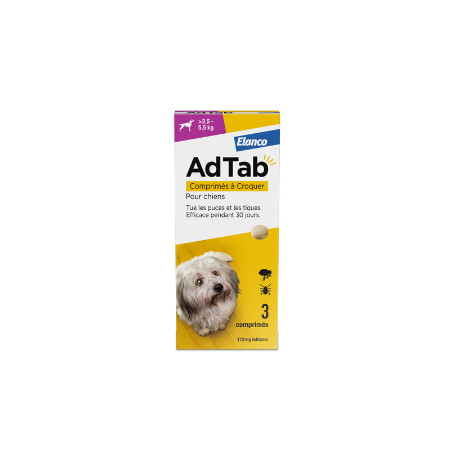 AdTab est efficace dans les 4 heures suivant l’attachement pour les puces (6 heures si déjà présentes avant l'administration), et dans les 48 heures pour les tiques Ixodes ricinus ou 8 heures si déjà présentes avant l’administration.