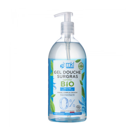 Gel douche Surgras Neutre 0% BIO du laboratoire MKL 3-en-1 pour corps, visage et cheveux pour les peaux fragiles et sensibles. Contient de l'Aloe Vera riche en acides aminés, minéraux et vitamines aux propriétés hydratantes, apaisantes, antioxydantes, et régénérantes. De l’huile d’Argan du Maroc riche en vitamine E et antioxydants, nourrit, régénère et lutte contre les signes du vieillissement cutané pour redonner douceur et souplesse aux peaux déshydratées et tiraillées.