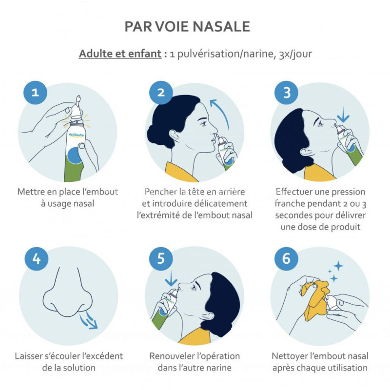Nourrissons : 1 pulvérisation dans chaque narine 2 fois par jour, en position couchée sur le côté ou en position assise lorsque le nourrisson est en âge de s’asseoir, la tête inclinée sur le côté.