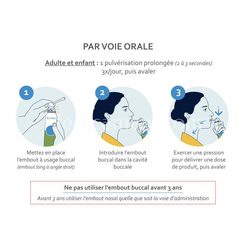 1 pulvérisation prolongée (2-3 sec.) 3 fois par jour, directement dans la cavité buccale avant d'avaler.