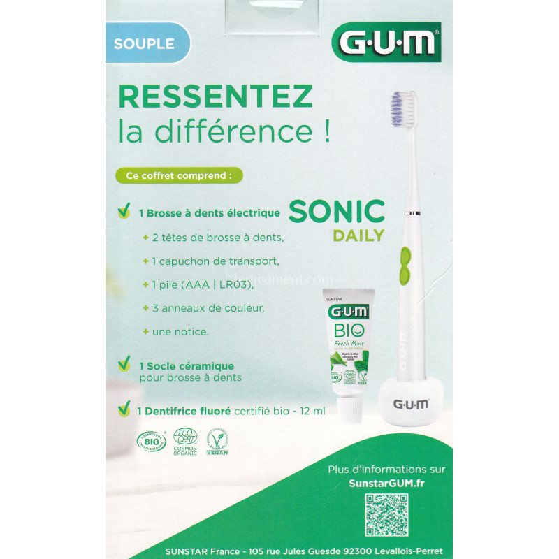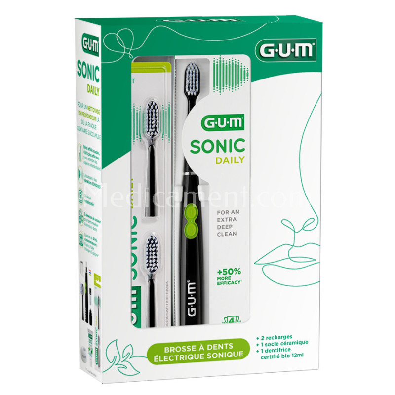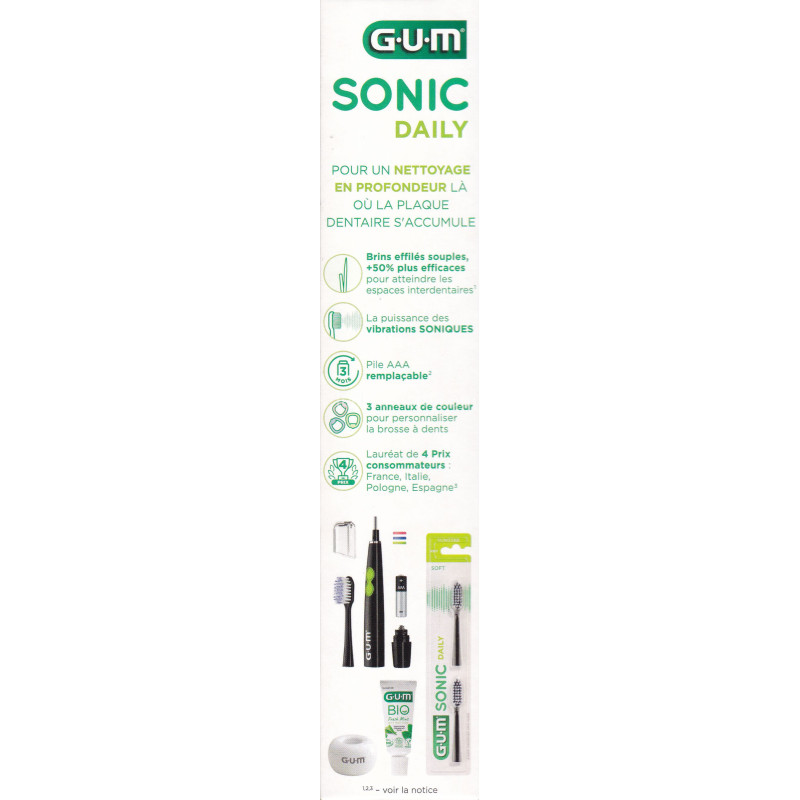 La Brosse à dents sonique Gum nettoie en profondeur là où la plaque dentaire s'accumule grâce à ses vibrations, atteint efficacement les espaces interdentaires grâce à ses brins souples effilés, et élimine même le tartre dans le sillon gingival.