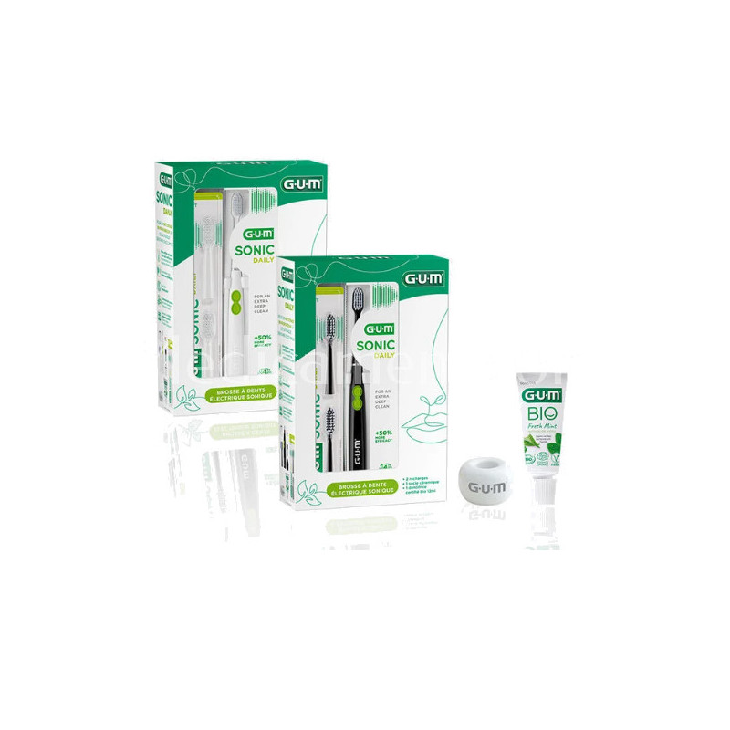 Brosse à dents sonique rechargeable + 2 têtes de rechange + 1 socle céramique + 1 dentifrice BIO (12 ml).