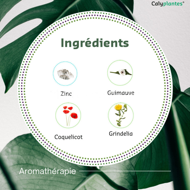 Eau purifiée ; fructose ; miel d’eucalyptus ; stabilisant: glycérol ; extrait sec de guimauve (Althaea officinalis L.) ; extrait sec de grindélia (Grindelia robusta Nutt.) ; extrait sec de coquelicot (Papaver rhoeas L.) ; propolis ; arôme ; conservateurs : benzoate de sodium, sorbate de potassium ; gluconate de zinc ; correcteur d’acidité : acide citrique.