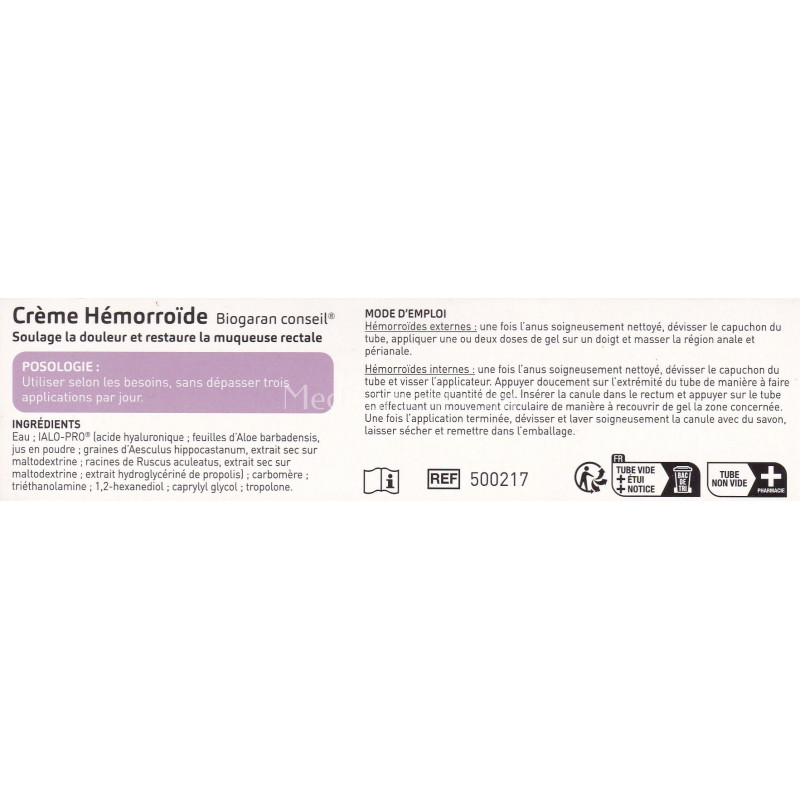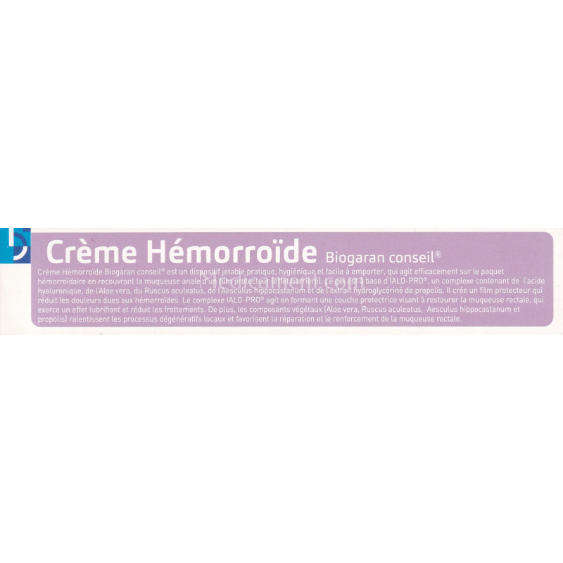 La Crème Hémorroïdaire du laboratoire Biogaran est un gel à base d'IALO-PRO, un complexe contenant de l'acide hyaluronique, de l'Aloe vera, du Fragon petit-houx (Ruscus aculeatus), du Marron d'Inde (Aesculus hippocastanum) et de l'extrait hydroglycériné de propolis. Ce complexe IALO-PRO possède une action est efficace sur le paquet hémorroïdaire en recouvrant la muqueuse anale d'un film protecteur avec un effet barrière :