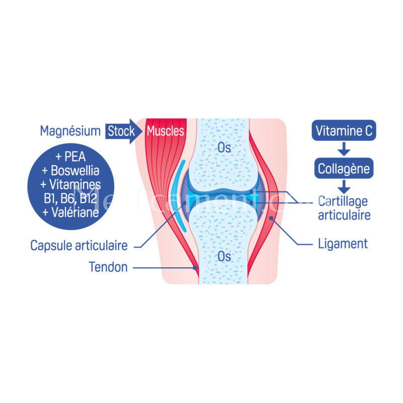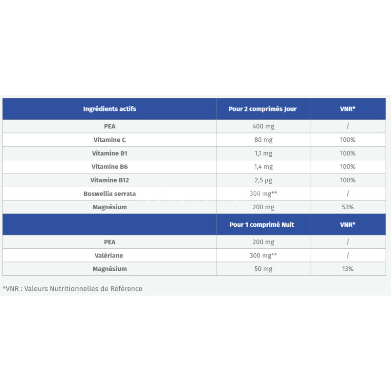 Ingrédients Comprimé JOUR : maltodextrine, hydroxyde de magnésium ; agent de charge : cellulose microcristalline ; palmitoylethanolamide (PEA) ; stabilisant : polyvinylpoly-pyrrolidone ; vitamine C ; extrait de Boswellia serrata (origine Asie) ; antiagglomérants : acide stéarique, sels de magnésium d’acides gras ; agents d’enrobage : hydroxypropylmethylcellulose, glycérine ; vitamines : B6, B1, B1222/08/2025