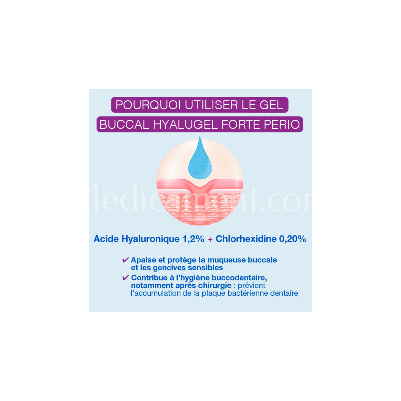Six fois plus concentré en acide hyaluronique que Hyalugel Gel Buccal classique, sa formule contient 0,20 % de Digluconate de Chlorhexidine anti-plaque et antibactérien et 1,2 % d’Acide Hyaluronique apaisant et à l'action régénératrice de la muqueuse et des tissus. Grâce à l’action combinée de l’acide hyaluronique de haut poids moléculaire et de la chlorhexidine, il prévient l’accumulation de la plaque bactérienne dentaire, principal agent responsable des maladies parodontales et contribue ainsi à l’hygiène buccodentaire, notamment après chirurgie. La présence de xylitol facilite le processus de salivation et évite la prolifération bactérienne en contrant la formation de biofilm et de plaque dentaire, ainsi qu’en restaurant le pH naturel de la cavité orale.