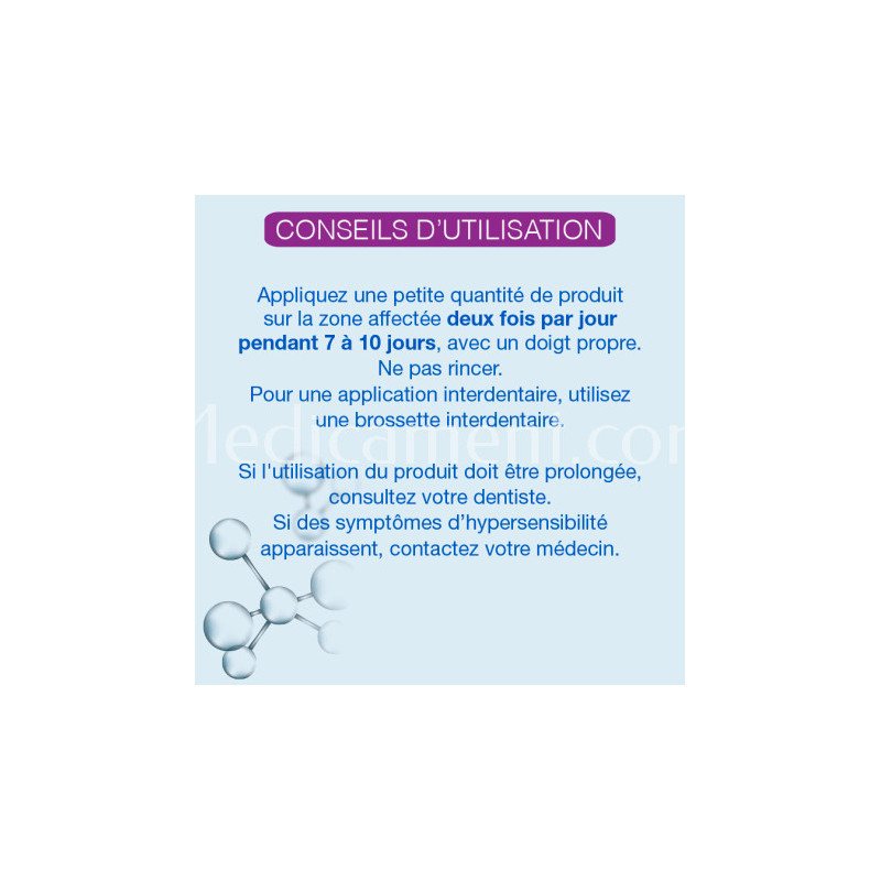 Si l’utilisation du produit nécessite d’être poursuivie, consultez votre dentiste. Si des symptômes d’hypersensibilité apparaissent, contactez votre médecin.