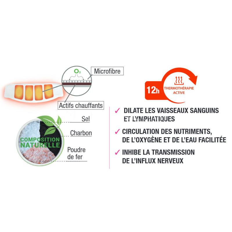 Les composants naturels du patch (fer, eau, charbon actif ) vont réagir en contact avec l’oxygène et créer de la chaleur. La chaleur appliquée localement va réduire l’influx nerveux et donc la sensation de douleur. Elle va permettre de détendre les muscles utérins en améliorant l’élasticité des tissus.