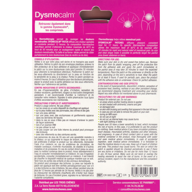 DYSMECALM® Patchs diffuse une chaleur agréable et constante pendant 12 heures sur 4 zones de chauffe pour une meilleur répartition de son action. Sa forme idéale permet d’agir sur tout le bas du ventre, permettant de soulager les maux de ventre liés aux douleurs des menstruations ou même dans le dos. Il peut être collé directement sur la peau ou sur les sous-vêtements.