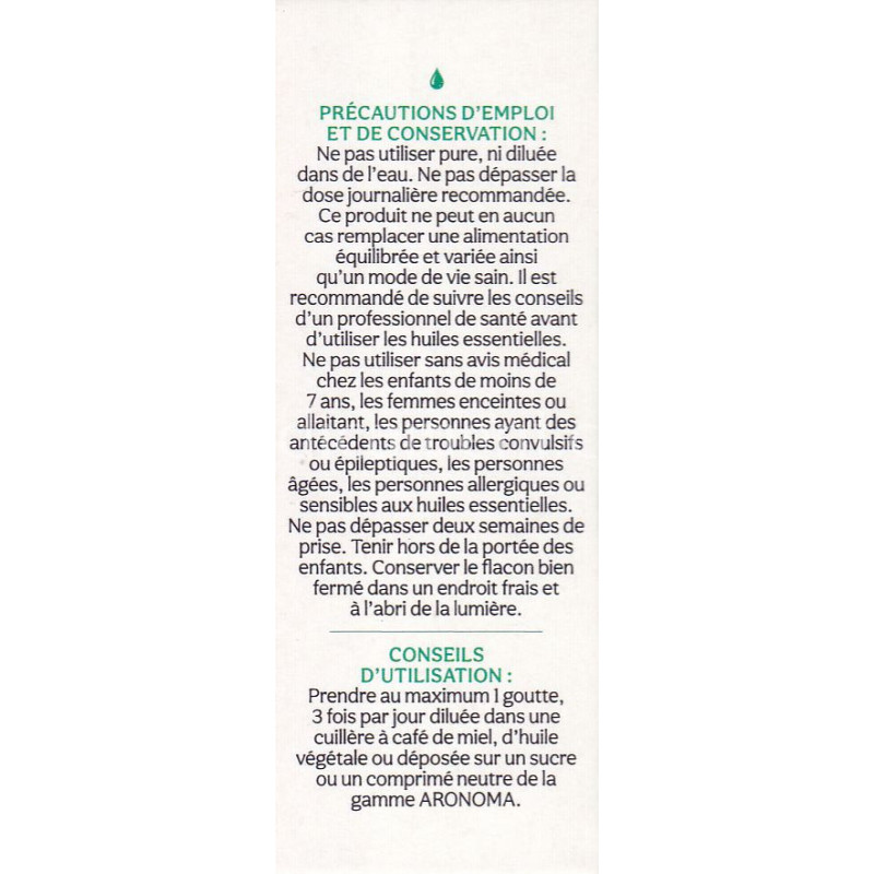 Prendre au maximum 1 goutte, 3 fois par jour diluées dans une cuillère à café de miel, d'huile végétale ou déposée sur un sucre ou un comprimé neutre.
