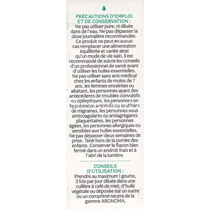 Prendre au maximum 1 goutte, 3 fois par jour diluées dans une cuillère à café de miel, d'huile végétale ou déposée sur un sucre ou un comprimé neutre.