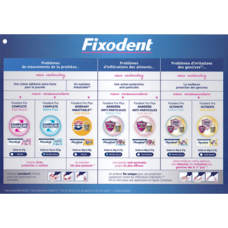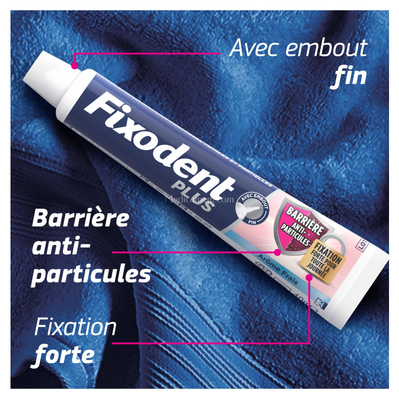 Fixodent est une crème fixative pour prothèses dentaires pour une tenue forte, un confort amélioré et une protection anti-particule. Adaptée aux prothèses dentaires partielles ou complètes, la crème fixative créée des coussins entre les gencives et la prothèse et lui permet ainsi de rester en place toute la journée. La protection anti-particules évite aux alimentaires de s'infiltrer sous la prothèse et provoquer des douleurs par irritation des gencives.