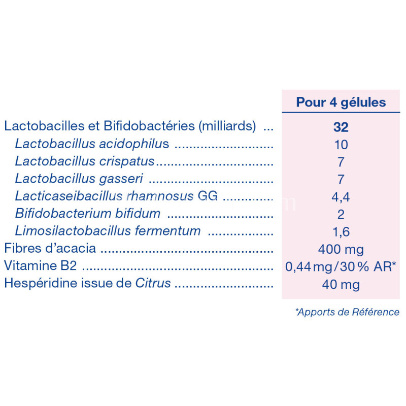 Ingrédients : Amidon de pomme de terre, fibres d'acacia (Acacia senega (L.), lactobacilles et bifidobactéries lyophilisés, hespérine issue de Citrus sinensis (L.) Osbeck, vitamine B2 (riboflavine), antiagglomérant : sels de magnésium d'acides gras ; antioxydant : acide ascorbique. Gélule végétale (hydroxypropylméthylcellulose).