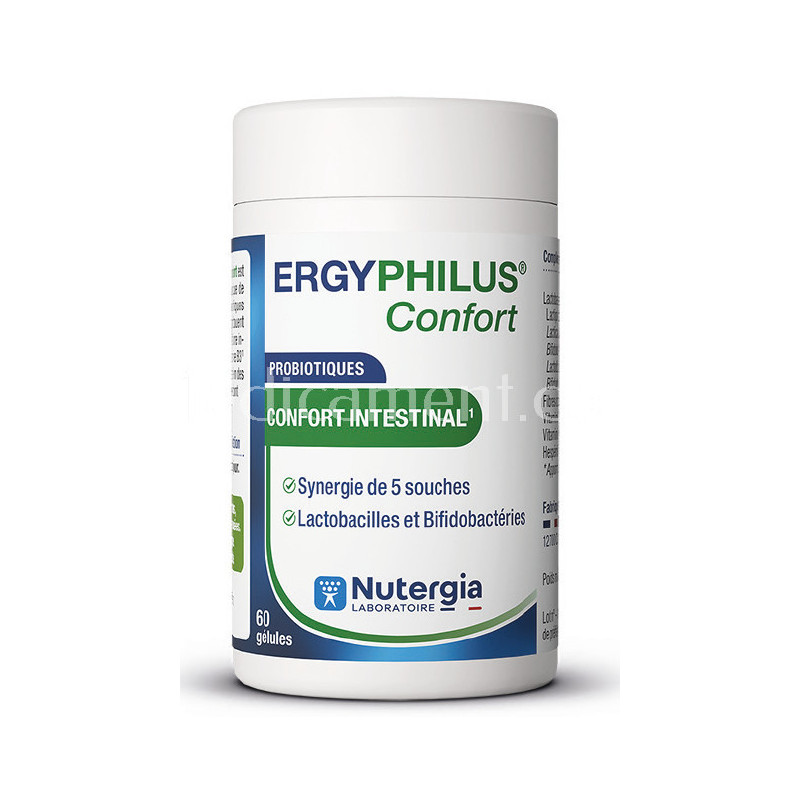 ERGYPHILUS Confort est une synergie unique de 5 souches probiotiques vivantes qui contribuent à l'équilibre de la flore intestinale. La présente de vitamine B3 dans sa formulation contribue au maintien des muqueuses saines, dont celle de l'intestin.