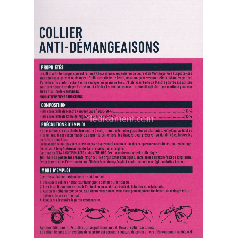 Le collier anti-démangeaisons est formulé à base d'huile essentielle de Cèdre et de Menthe poivrée aux propriétés anti-démangeaisons et apaisantes. L'huile essentielle de Cèdre, reconnu pour ses propriétés apaisantes, permet d'améliorer le confort cutané et de soulager les peaux irritées. L'huile essentielle de Menthe poivrée est utilisée pour contribuer à soulager l'irritation et réduire les démangeaisons. Le produit agit de façon continue pour une durée d'action de 4 semaines.