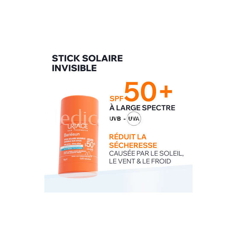 Le Stick Solaire Invisible SPF50+ BARIÉSUN du laboratoire Uriage allie le plus haut niveau de protection solaire à une texture cristal invisible. Idéal pour un effet glowy naturel, il sublime le teint tout en protégeant votre peau au quotidien (réduit le dessèchement causé par le sable/le vent/ le soleil/ les basses températures).